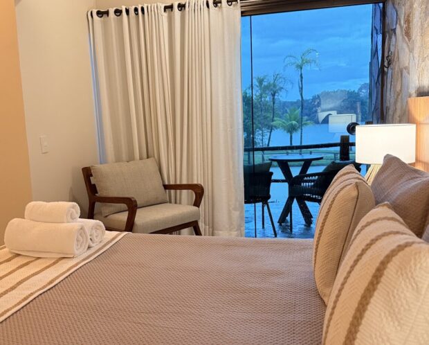 Suíte ampla e aconchegante, com vista para o lago e piscina privativa aquecida, ideal para momentos de descanso com total privacidade. Conta com cama king size, enxoval de 600 fios, Smart TV 50” com mais de 130 canais Sky, Wi-Fi exclusivo, banheiro privativo, ar-condicionado e frigobar, oferecendo conforto, sofisticação e bem-estar em cada detalhe.